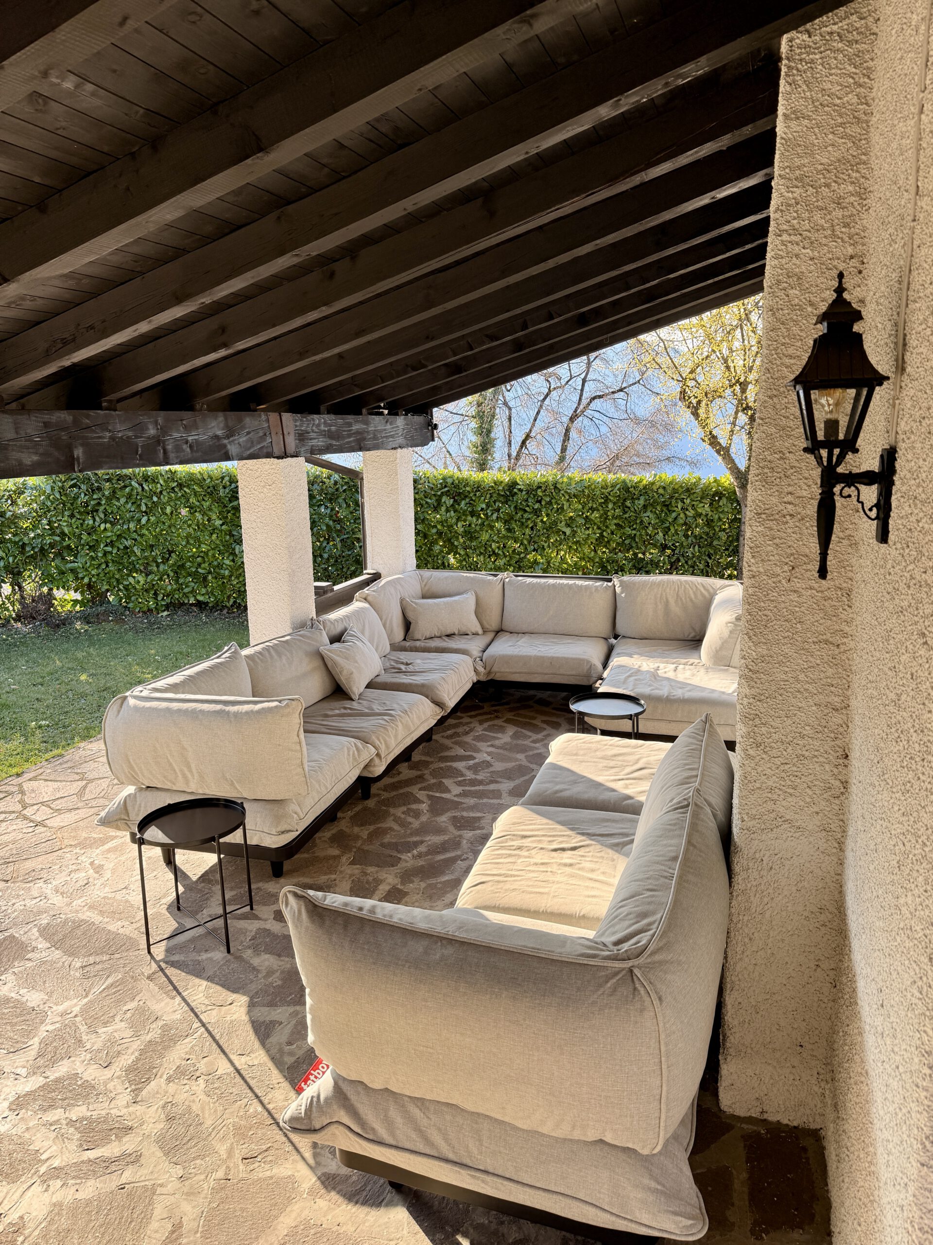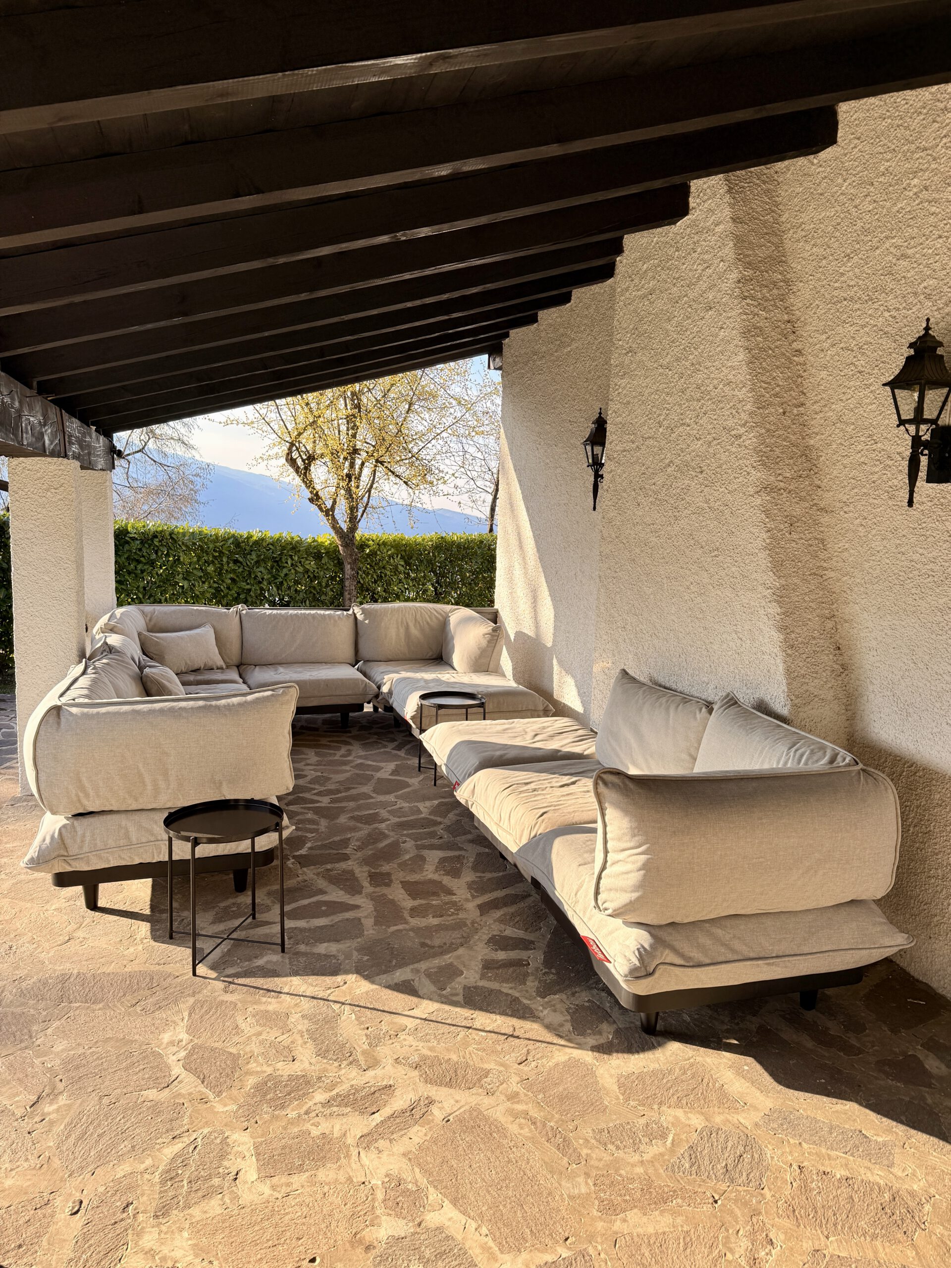 Die Taverna ist separat über eine überdachte Außentreppe erreichbar und bildet einen eigenständigen Rückzugs-, Aufenthalts- und Arbeitsbereich. Neben Sitz- und Lounge-Bereichen steht hier ein großer Tisch zur Verfügung, der sich auch gut für Arbeiten oder Besprechungen eignet; WLAN ist auch auf dieser Ebene verfügbar.
